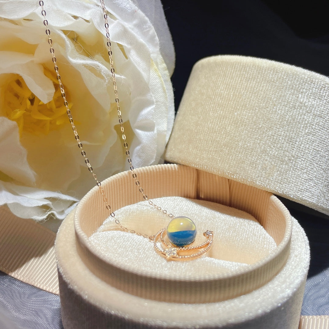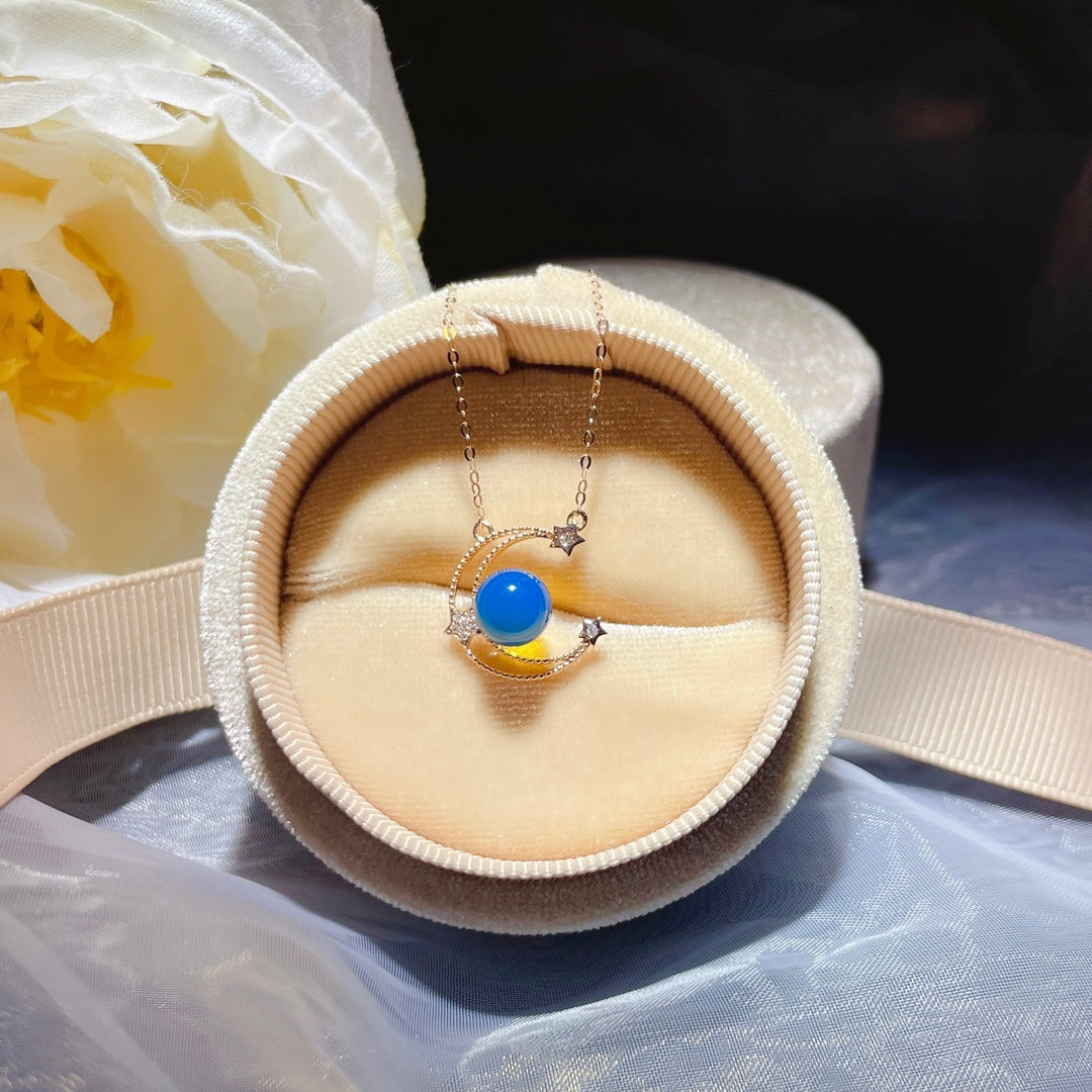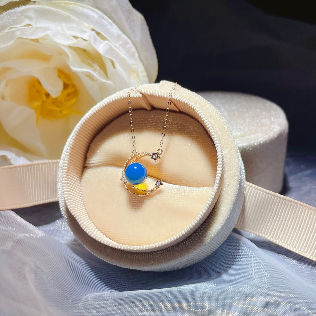 احتضن العالم الرومانسي بداخلك، بينما تعتز باللحظات اليومية. نقدم لكم قلادة العنبر الأزرق الدومينيكي الرائعة المطلية بالذهب عيار 18 قيراط، وهي تحفة حقيقية تجسد جوهر الأناقة والرقي.