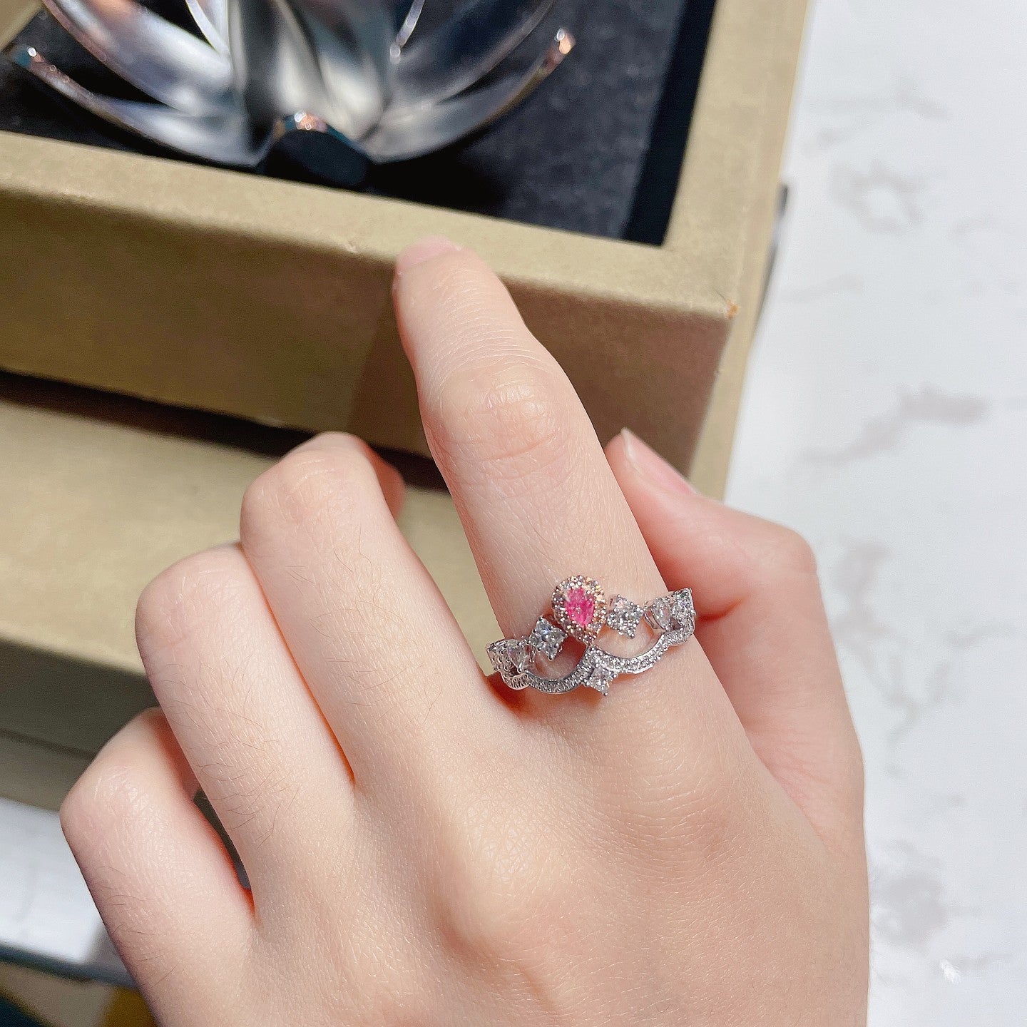 Hemmottele upean 18K Pink Diamond Drop Princess Square Crown Ring -sormuksen runsautta, joka on todellinen luksuskorujen mestariteos. Tässä sormuksessa on häikäisevä D0,13 ct:n pääkivi, jota täydentää elegantti joukko sivukiviä, joiden yhteismäärä on 0,49 ct, kaikki kauniisti 3,13 g:n mestariteoksessa. Täydellisesti muotoiltu se on saatavana kooissa 11, 12, 14, 15 ja 17# (säädettävä täydellisen istuvuuden saavuttamiseksi).