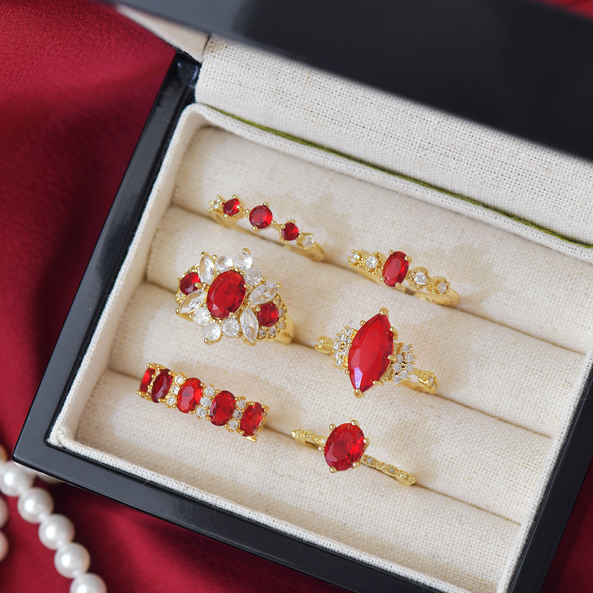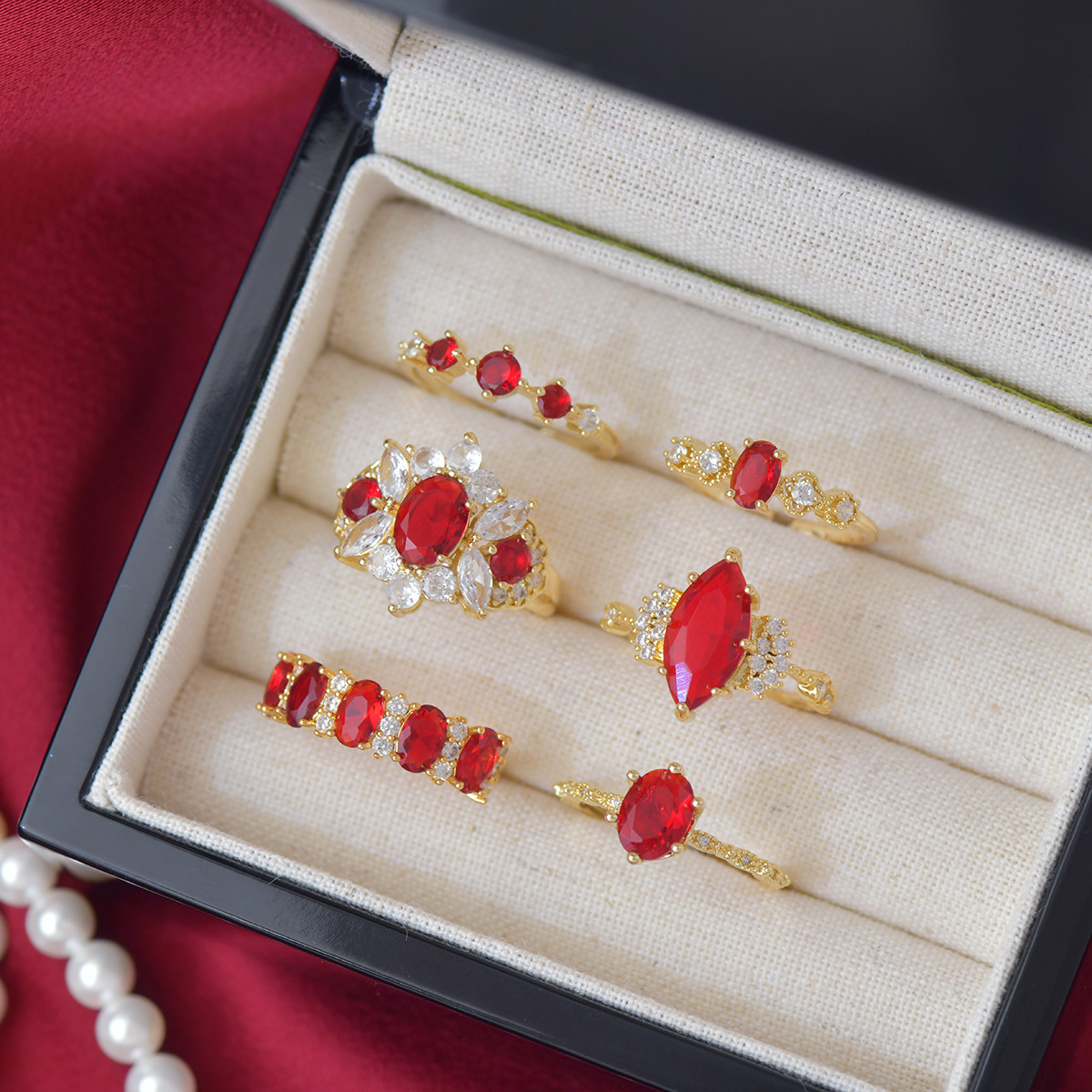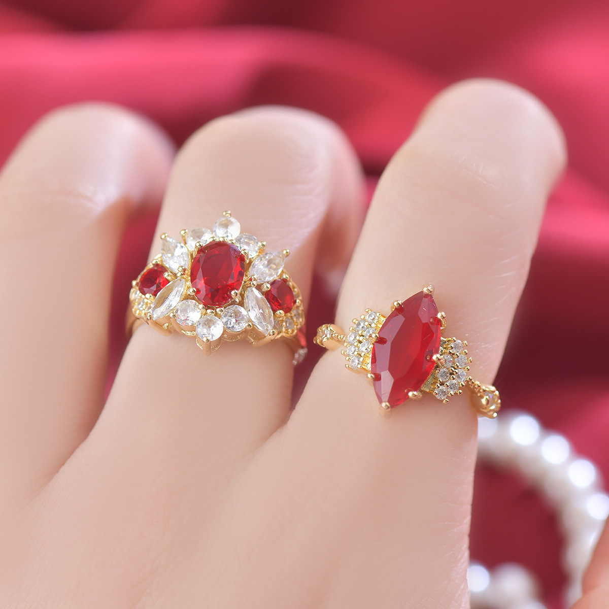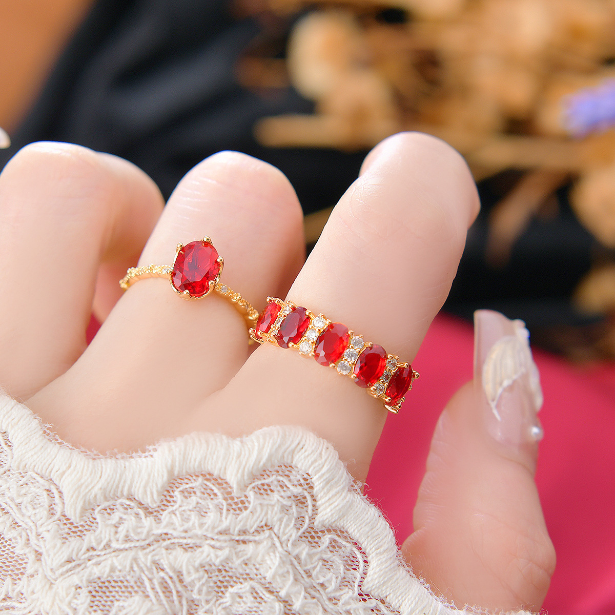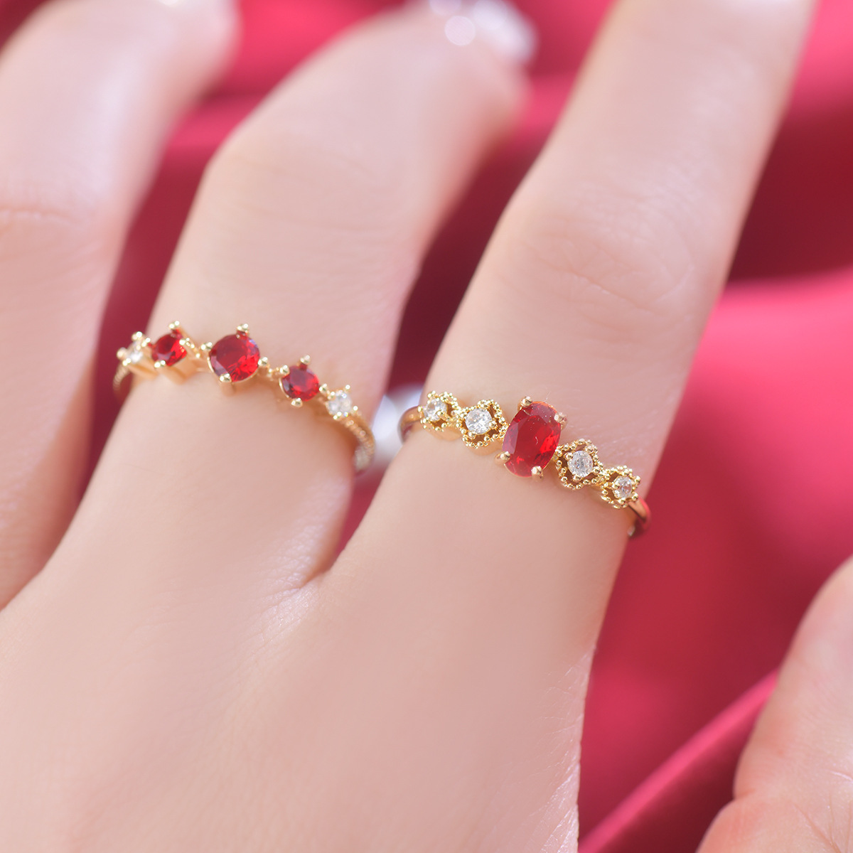 Color: Wine red full diamond single ring, wine red oval single ring, wine red diamond single ring, wine red three zirconium single ring, wine red lace single ring