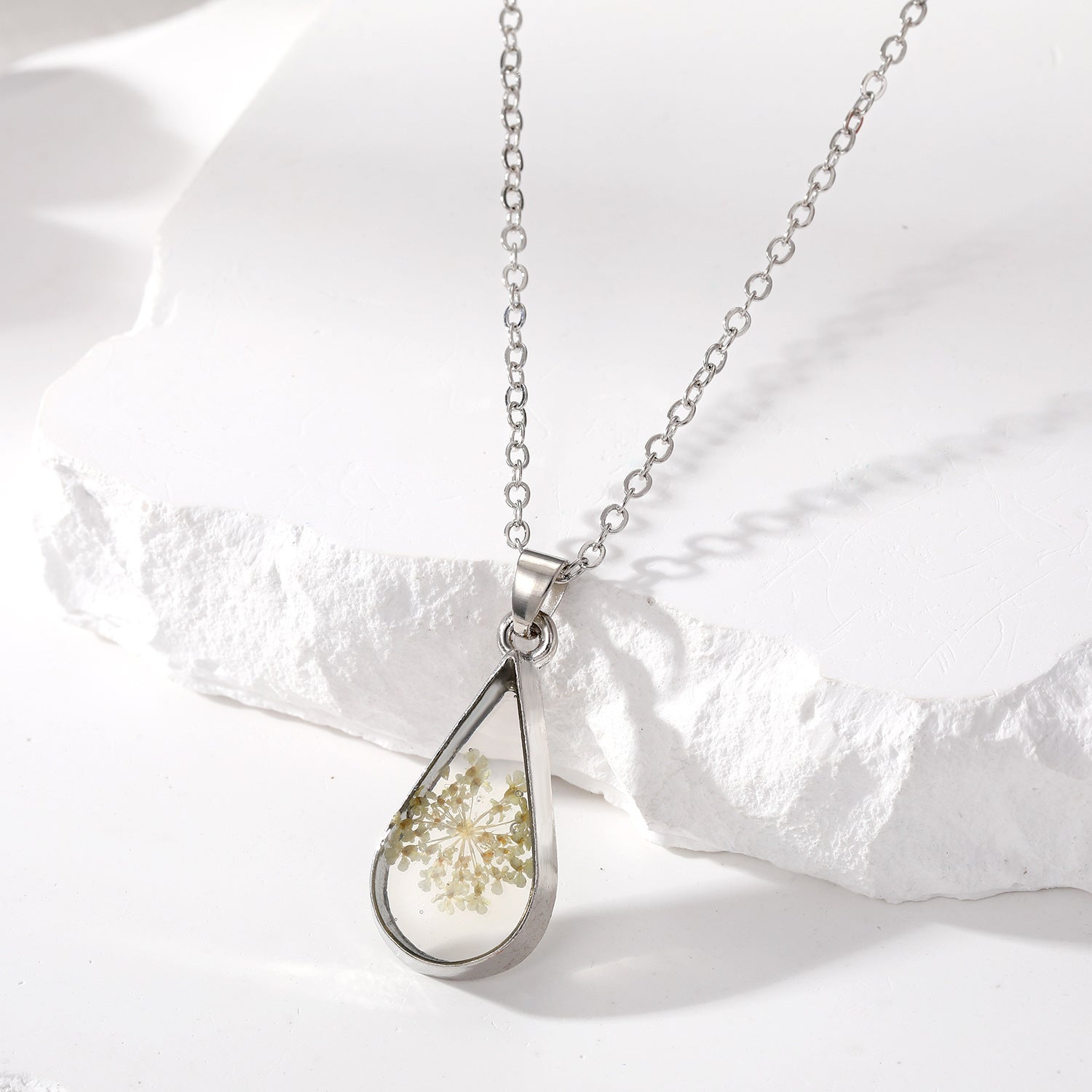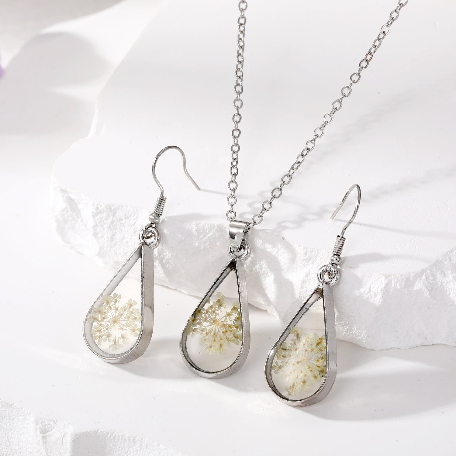 Original European And American-style Waterdrop-Shaped Dried Flower Babys Breath Bouquet Necklace And Earrings